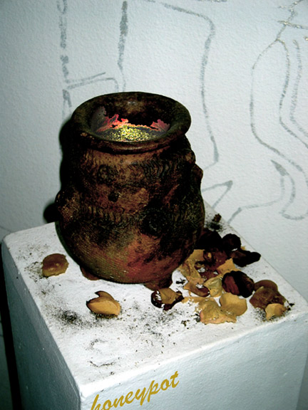 Stations of the Goddess: Ambrosia, 1993. Clay pot filled with honey, electric light, and rose petals, 12" x 12" x 12"
