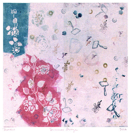 Three-plate monotype utilizing stencils and hand stamping, 17" x 17"