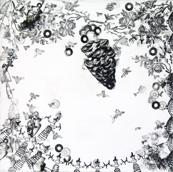 In the Garden of the Bee Priestess I: Sacred Grove 1, 2007, Edition 10 Etching on Rives White BFK; Image: 12" x 12," paper: 24 X 22 1/4" (Master Printer: Mark Mahaffey, Mahaffey Fine Arts, Portland, Oregon)